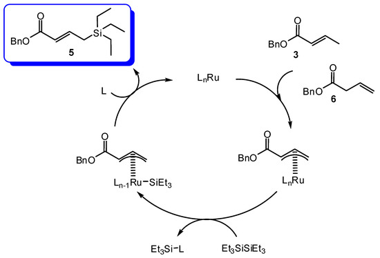 An allylic mechanism, by intermediacy of allyl-Ru complexes, might also be considered in the generation of 5 from the internal (3) and terminal olefin (6) when the disilane Et3SiSiEt3 would be present in the reacting system (Scheme 3).
