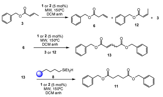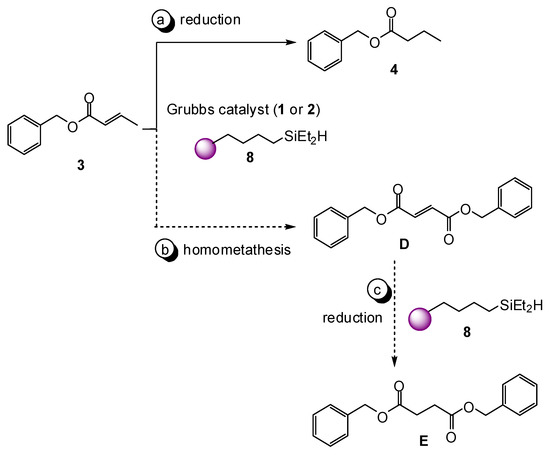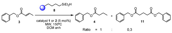 As mentioned in the Introduction, solid-phase reagents are gaining popularity in synthesis due to some comparative advantages especially useful for flow chemistry. Particularly, to the best of our knowledge, silanes immobilized on solid phase have not been applied to non-metathetic hydrogenations. Using high-loading Merrifield resin, we prepared 4-(diethylsilylbutyl) polystyrene resin (8) in two steps according to literature [44] (Table 2). Upon reacting benzyl trans-crotonate (3) with 8 in presence of catalyst 1 or 2, a different outcome has been attained. Concerned are both the nature of the products and a more intricate pattern of the reactions routes, this time also involving metathesis (Table 2).