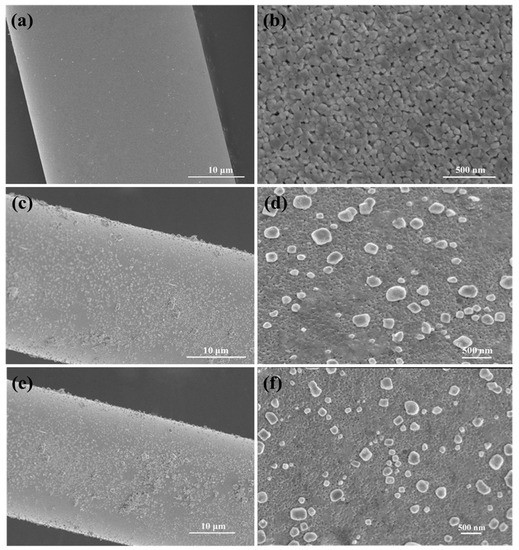 Figure 1 presents typical SEM images of TF, AgCl@TiO2 fibers (CTF) and S-CTF. The diameters of the fibers are about 30 μm. In Figure 1a,c,e, the surface of TF is homogeneous and smooth, while the surface of CTF and S-CTF are rough. Local enlarged images of TF, CTF and S-CTF are shown in Figure 1b,d,f, in which the porous structure that formed by the agglomeration of TiO2 nanoparticles can be observed. AgCl particles with diameters less than 300 nm (Figure 1d) were successfully deposited on TF. However, there is no significant difference between the SEM images of CTF and S-CTF. The existence of Ag0 cannot be observed through SEM, but will be confirmed by XRD, XPS and UV-vis DRS.