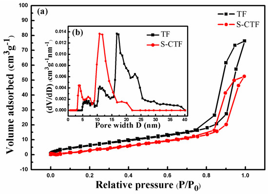 N2 adsorption-desorption isotherms (a) and pore-size distribution (b) of TF and S-CTF.