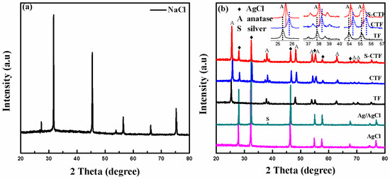 Figure 3a shows XRD patterns of NaCl produced in the neutral reaction of NaOH and HCl. According to Joint Committee on Powder Diffraction Standards (JCPDS) standards, its crystal form is confirmed to be halite NaCl by diffraction peaks at 27.4°, 31.7°, 45.4°, 53.7°, 56.4°, 66.2° and 57.3°. XRD patterns of AgCl, Ag/AgCl, TF, CTF and S-CTF are shown in Figure 3b. Diffraction peaks of TF, Ag@TiO2(CTF) and S-CTF at about 25.3°, 37.8°, 48.1°, 53.9°, 55.1°, 62.7°, 68.7°, 70.3° and 75.1° belong to (101), (004), (200), (105), (211), (204), (116), (220) and (215) reflections [36] of anatase TiO2 (JCPDS No. 21-1272), while diffraction peaks of AgCl, Ag/AgCl, CTF and S-CTF at about 27.9°, 32.3°, 46.3°, 54.9°, 57.5°, 67.5° and 76.7° are in accordance with the (111), (200), (220), (311), (222), (400) and (420) planes [37] of cubic phase AgCl (JCPDS No. 31-1238). A weak diffraction peak at of cubic phase Ag (JCPDS No. 65-2871) in Ag/AgCl confirmed the successful photoreduction of AgCl and the formation of Ag0. However, no obvious diffraction peak of Ag0 occurred in S-CTF, which is due to the peak overlap with anatase (at about ) and its high dispersion. Otherwise, anatase peaks of CTF and S-CTF show about 0.45 and 0.2 shifts compared with TF (inset in Figure 3b), which is mainly caused by the combination of AgCl and the formation of Ag0. The shift of anatase peaks towards higher angles indicate a lattice expansion [38] due to the AgCl and Ag0 nanoparticles in the interlayer space of anatase gains agglomerated fibers.