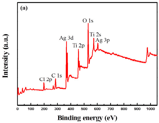The XPS survey spectrum of S-CTF (Figure 4a) shows all peaks of Ti, O, Ag, Cl and C elements. The peak for C 1s at 284.6 eV is mainly from the adventitious hydrocarbon, due to the XPS instrument itself. The result of the survey of the XPS spectrum is consistent with the XRD results.