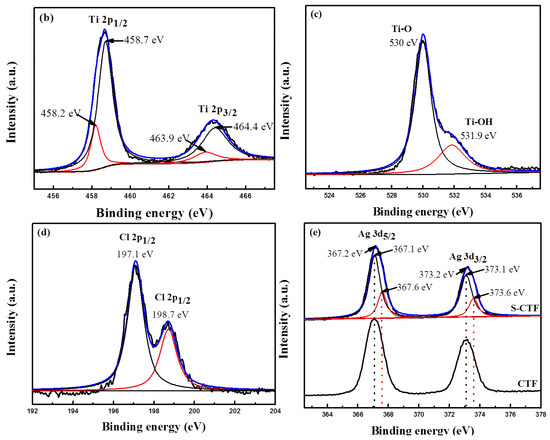 The valence state of Ti, O, Cl and Ag in S-CTF are investigated by the high-resolution XPS spectrum (Figure 4b–e). As shown in Figure 4b, the binding energy at 458.6 and 464.6 eV of Ti 2p1/2 and Ti 2p3/2 are lower than those of pure TiO2 (459.4 and 464.7 eV) [39]. The curve resolution of the Ti 2p signal of S-CTF indicates four different peaks. The peaks at binding energies of 458.2 and 463.9 eV belong to Ti 2p1/2 and Ti 2p3/2 of Ti3+, while the other two peaks at 458.7 and 464.4 eV belong to Ti 2p1/2 and Ti 2p3/2 of Ti4+ [40]. Ti3+ (and oxygen vacancy) in S-CTF was produced during the heat treatment by the reduction of TF (the removal of partial lattice oxygen) with organic matters in steam as a reducing atmosphere. The O 1s region is decomposed into two peaks at 530 and 531.9 eV (Figure 4b). The two kinds of oxygen contributions are ascribed to Ti–O in TiO2 and the OH in Ti–OH (adsorbed water on the surface of S-CTF) [35]. In Figure 4c, two signal peaks of Cl 2p1/2 and Cl 2p3/2 at binding energy of 197.1 and 198.7 eV with a separation of 1.6 eV confirmed the Cl− from AgCl [41]. The Ag 3d region is decomposed into four peaks (Figure 4e). Binding energy peaks at 367.6 and 373.6 eV are ascribed to Ag0, while 367.1 and 373.1 eV correspond to Ag+ in AgCl particles [26,42]. The difference of binding energy (0.1 eV) between CTF and S-CTF also indicates the formation of Ag0. According to the results of XPS, the detail atomic percentages of Ag, AgCl, and TiO2 on the surface of S-CTF were about 8.5%, 40.7% and 51.8%, respectively. Moreover, the interaction among Ag, AgCl and TiO2 [43] is further confirmed by the binding energy shifts peaks for all elements compared with standard values.