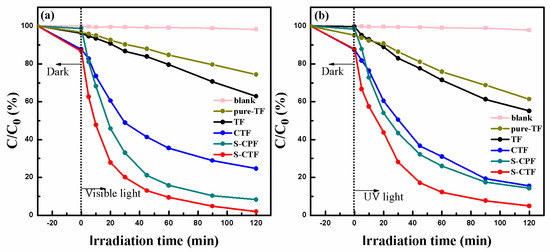 Photocatalytic degradation of 100 mL X-3B (20 mg L−1) over pure-TF TF, CTF, S-CPF and S-CTF (0.05 g) under visible light (a) and ultrasonic light (b) with blank control groups.