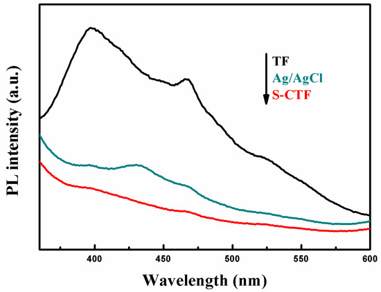 The recombination of the photoinduced electrons and holes is a crucial factor in a photocatalytic reaction for the decrease of quantum yield. The efficiencies of photo-generated carriers [12,49,50] are explained by PL analysis. A strong emission peak of TF is observed at about 400 nm with the excitation wavelength at 325 nm (Figure 7), which indicates the direct recombination of electrons and holes. No obvious emission peak is observed in PL spectra of Ag/AgCl and S-CTF, while S-CTF shows lower PL intensity than Ag/AgCl, indicating its better separation capacity caused by the interaction among Ag, AgCl and TiO2. The results of PL analysis are in accordance with the results of XRD and XPS. Otherwise, an additional peak of TF (at about 470 nm), belonging to oxygen vacancy [51], further confirms the formation of oxygen vacancy and Ti3+.