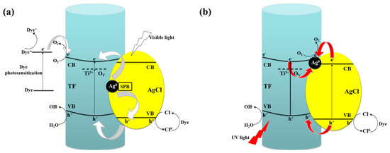 Figure 8b shows the photocatalytic mechanism of S-CTF under UV light. The transformation of electron-hole pairs is different from visible irradiation. According to the CB and VB edge potentials of TiO2 (−0.29 and 2.91 eV [40]) and AgCl (0.09 and 3.16 [55]), both TiO2 and AgCl are excited under UV irradiation. The generated holes of AgCl can easily inject into the VB of TF [41], and then yield •OH with adsorbed water molecules, or directly degrade organic pollutants such as the holes generated by TF. The holes also yield Cl0 and reduce this to Cl− via the same route under visible irradiation. The electrons generated from the CB of TF and AgCl transfer to Ag0, which serves as an electron trap under UV irradiation [48,56]. These electrons participate in the formation of •O2− radicals. Moreover, the oxygen vacancy in TF is also beneficial to trap electrons and promote their separation under visible or UV light irradiation [40].