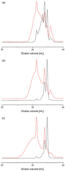 GPC eluogram of glycerol oligomers obtained with K2CO3 (4 wt %) as catalyst: (a) 300 W after 20 (black) and 30 min (red); (b) 600 W after 5 (black) and 10 min 30 s (red); (c) 800 W after 4 (black) and 6 min 20 s (red).