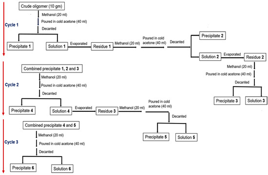 In order to improve the polydispersity by separating the low molecular weight byproducts, we also devised a simple purification process. The newly prepared, crude product was first dissolved in a minimal amount of methanol, and then precipitated with the addition in cold acetone (Figure 6). Consequently, the resulting precipitate was enriched with large oligomers, while smaller product remained in the solution phase. An iteration of this purification process yielded good results after three precipitation steps in the first cycle. Further, two more cycles with a decreasing number of precipitation steps yielded a highly pure oligomer mixture compared to the crude product (Figure 5). Indeed, starting with 10 g of crude product, we obtained 2.6 g of a glycerol oligomer mixture with a high molecular weight of Mw = 1302 Da and a low dispersity of 1.5.