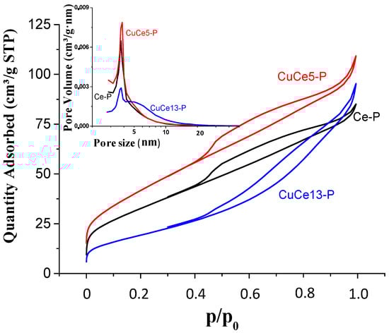 Figure 1 shows the adsorption-desorption isotherms as well as the pore size distribution for the catalysts of the P-series. The isotherm shape of these catalysts is intermediate between type II and type IV, showing a clear mesoporous structure. The incorporation of 5 wt % CuO favours the incorporation of mesoporosity compared to the pure ceria, which leads to an increase in the surface area from 120 to 154 m2·g−1. In the inset of Figure 1, it can be seen that the pore size distribution is similar with a narrow peak centred at ca. 3.7 nm. In contrast, the incorporation of 13 wt % CuO decreases the mesoporosity and widens the pore distribution beyond 10 nm. CuO crystallites seem to be blocking the mesopores and this involves a drastic decrease of the surface area until 71 m2/g.