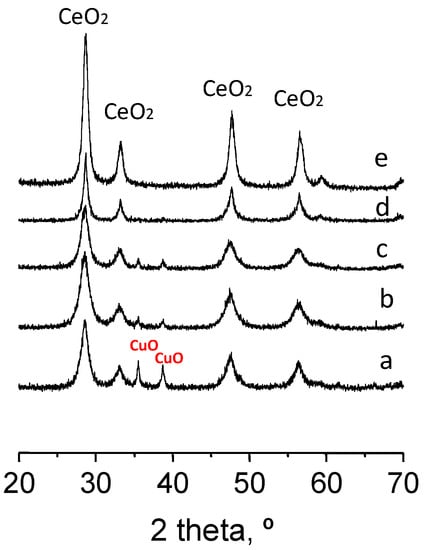 XRD patterns of representative ceria and Cu-doped ceria catalysts prepared by different synthesis procedures: (a) CuCe13-P; (b) CuCe5-P; (c) CuCe5-C; (d) CuCe5-U; (e) Ce-P.
