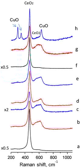 Raman spectra of representative ceria and Cu-doped ceria catalysts prepared by different synthesis procedures: (a) Ce-U; (b) CuCe5-U; (c) CuCe13-U; (d) CuCe5-C; (e) CuCe13-C; (f) Ce-P; (g) CuCe5-P; (h) CuCe13-P.