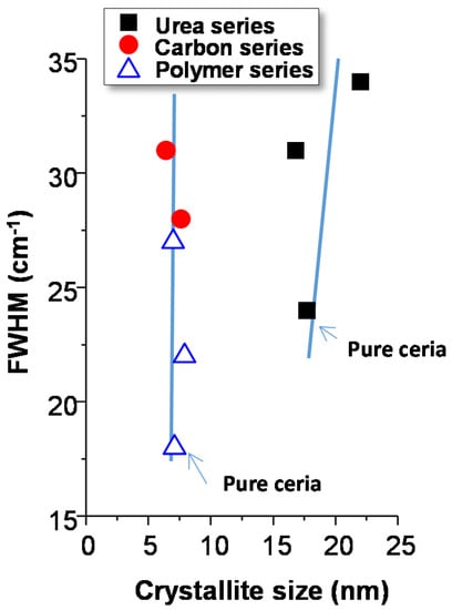 On the other hand, the width of Raman bands (usually quantified by the FWHM of the main ceria band at 460 cm−1) has been related to both the size of the ceria crystallites and the concentration of oxygen vacancies of ceria []. Thus, the wider the band the lower is the ceria crystallite size and/or the higher is the number of oxygen defects. In order to estimate the number of vacancies, the FWHM of the band at 460 cm−1 is represented with the ceria crystallite size estimated by XRD (Figure 4). It can be observed that the catalysts prepared using carbon or polymer present a particle size remarkably lower than those prepared using urea. However, the width of the Raman band of the Cu-ceria catalysts is similar or even higher in the urea catalysts. This seems to indicate that the urea catalysts present the highest concentration of oxygen defects, which is the same conclusion obtained when the I600/I460 ratio is considered. Similarly, it is shown that the crystallite size between pure ceria and copper doped ceria prepared by the same method is similar. However, the FWHM values of pure ceria catalysts are lower than the corresponding copper-containing samples, suggesting again that the addition of Cu increases the concentration of oxygen defects.