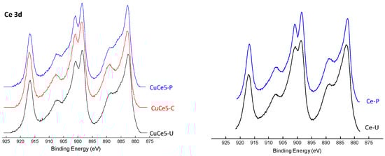 X-ray photoelectron spectroscopy was conducted on the catalysts without and with 5 wt % CuO (Figure 5), in order to provide information about the oxidation state of cerium on the surface and the possible outer vacancies (XPS extends from the first layer to a depth of only 50–70 Å). The interpretation of the XPS spectrum of Ce3d (Figure A1) is very complex with overlapped peaks, although a rather precise deconvolution can be made [,]. The spectra show two main signals at binding energies about 901 and 883 eV, which are assigned to Ce 3d3/2 and Ce 3d5/2, respectively. These peaks together with additional satellite peaks at ca. 917.1, 907.8, 898.5 and 889.2 eV are related to their ionization processes and are typical of Ce4+ species. On the other hand, peaks at 902.6, 898.8, 884.4 and 880.7 eV are characteristic of Ce3+ species. The number of reduced, non-stoichiometric cerium species in the outer layers of the catalysts shows no difference regardless of the preparation methods and of the presence of copper. Thus, in all cases Ce3+/(Ce3++Ce4+) is 0.11–0.12.