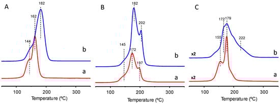 Temperature programmed reduction profiles for Cu-ceria catalysts synthesized with polymer (A), carbon (B) and urea (C); CuO wt % of 5 (a) and 13 (b).