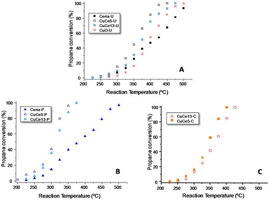 Variation of the propane conversion with the reaction temperature for Cu-ceria catalysts synthesized with urea (A), polymer (B) and carbon (C). Reaction conditions in text.
