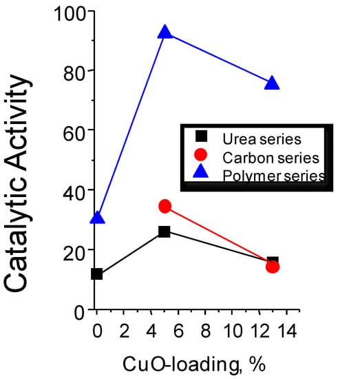 Moreover, in all series, the highest activity was obtained by the catalysts with low Cu-loading (five percent), see Figure 9. This fact is in line with the decrease observed in the surface area in those samples with higher copper loading.