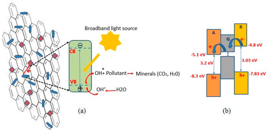 - Posa, V.R.; Annavaram, V.; Reddy Koduru, J.; Bobbala, P.; Madhavi, V.; Reddy Somala, A. Preparation of graphene-TiO2 nanocomposite and photocatalytic degradation of Rhodamine-B under solar light irradiation. J. Exp. Nano Sci. 2016, 11, 722736. [Google Scholar]