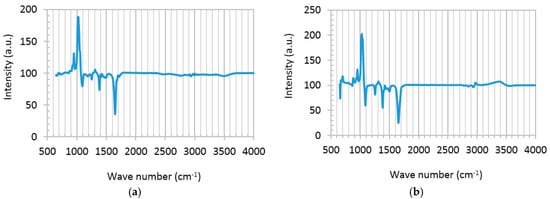 Chemical composition of graphene disperse (GD) and a mixture of GD and the TiO2 precursor solution (titanium isopropoxide bis(acetylacetonate) solution), abbreviated as TS, was studied using liquid-phase Fourier transform infrared spectroscopy (FTIR), shown in Figure 2. Typical graphene features appearing in both spectra are as follows: superimposed sharp peaks at 950–1100 cm−1 reflect C-O stretching on graphene surface, due to the presence of a small percentage of oxygen in the graphene used in this study. The bold signals at 1250, 1327 and 1385 cm−1 represent shifted C-O-C, C-O···H or C-O bindings, and imply interlinking of unsaturated –C and –OH groups in alcohols [28]. Signals at 1430, 1507 and 1580 cm−1 are related to bending vibration of H-C-H and C=O, perhaps formed during the long term dispersion of graphene in dimethylformamide (DMF). The weak reflection at 3450 cm−1 shows –OH stretching due to the hydroxyl groups attached to graphene planes [17,28]. The FTIR spectrum of the TS:GD solution presents some additional peaks (Figure 2b). Ti-O vibration is identified at 670 cm−1. The left shoulder absorption band at 807 cm−1 and the minor peaks around 2800–3100 cm−1 are consistent with Ti-O-C binding, showing the chemisorption between TS and GD solutions [15,28]. The same peaks (2800–3100 cm−1) may be attributed to metal (in this case, Ti) and methyl groups (Ti-CHx), as well [29].
