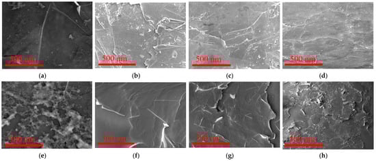 SEM surface topography images of graphene and graphene-TiO2 nanocomposite thin films, made by spin-SVPT and SVASC at various TS:GD volume ratios (for composite films) and annealing temperatures. (a) Pristine graphene, SVPT, 150 °C; (b) graphene-TiO2, SVPT, TS:GD = 1:9, 150 °C; (c) graphene-TiO2, SVPT, TS:GD = 1:4, 150 °C; (d) graphene-TiO2, SVASC, TS:GD = 1:4, 150 °C; (e) pristine graphene, SVPT, 450 °C; (f) graphene-TiO2, SVPT, TS:GD = 1:9, 450 °C; (g) graphene-TiO2, SVPT, TS:GD = 1:9, 450 °C; (h) graphene-TiO2, SVPT, TS:GD = 1:9, 450 °C. The films on the upper panel were annealed at 150 °C, while those on the lower panel were annealed at 450 °C. Images (a,e) show pristine graphene films, whereas others are images of graphene-TiO2 composite films prepared at various TS:GD volume ratios. The films associated with images (d,h) were made by SVASC, whereas the rest of the films were made using spin-SVPT.