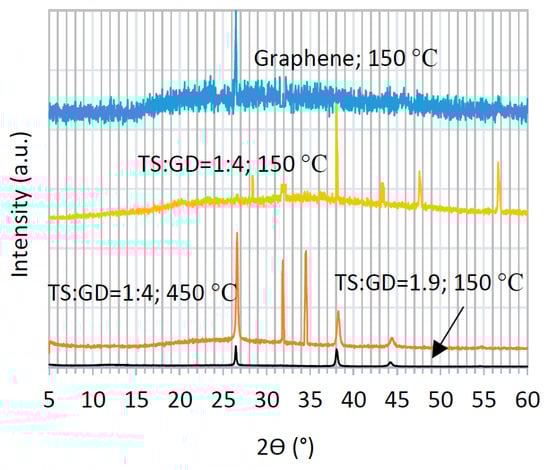 XRD patterns of graphene and graphene-TiO2 thin films prepared at various compositions (TS:GD volume ratios) and annealing temperatures.