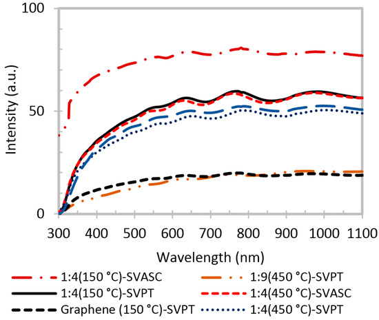 The transmittance spectra of graphene and graphene-TiO2 thin films are presented in Figure 5. In general, it is evidenced that the films with higher TiO2 content, deposited by SVASC, and annealed at 150 °C are more transparent. TiO2 is unable to absorb the photons in the visible range, due to its large band gap. Thus, it is expected that a higher TiO2 content in the thin film results in better transparency in the visible range [3,11]. The films annealed at 450 °C show low transparency, presumably due to their larger thickness, as shown in Figure S2, and the defective porous structure. The SVASC films show a relatively better transmittance, compared to spin-SVPT films, perhaps due to the destructive effect of the centrifugal forces that may cause detachment of titanium in the form of hydrogels from the graphene network in the wet films. Therefore, even when deposited from the same precursor solution, the spray-on thin films contain larger amount of TiO2, thus showing higher transparency in the visible range.