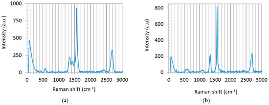 Raman spectra of graphene-TiO2 thin films present various patterns depending on the annealing temperature and the casting method. Here, we only display the Raman spectra of the film fabricated using precursor solution with TS:GD volume ratio of 1:4, fabricated by spin-SVPT and SVASC, and annealed at 150 °C (Figure 6). The Raman spectra of the films fabricated using the same precursor solution, but annealed at 450 °C are presented in Figure S3 of the Supporting Information. Raman spectra of the films deposited from the solution with TS:GD volume ratio of 1:9 showed no clear TiO2 peaks, due to the low content of TiO2 in the composite films and high intensity of graphene bands, which obscure the TiO2 peaks. The prominent peaks at 1570 cm−1 (G), 2700 cm−1 (G’: the unique feature of few-layered graphene) and the weak peak at 1350 cm−1 (D) are graphene reflections [23,24,32,33,34]. The sharp and symmetric graphene peaks indicate the small size, few-layered, nanoscale and homogenous form of graphene sheets [33,34,35]. We attribute the formation of this favorable structure to ultrasonic vibration, which homogenizes the film nanostructure. Another evidence of the smaller, few-layered configuration of graphene is the high intensity ratio of D to G peaks (ID/IG > 0.23). Small values of ID/IG (<0.2) suggest the presence of large graphite segments in the domain [34,35,36,37]. According to the Raman spectra of Figure 6, in both SVPT and SVASC films this value is above 0.24. The signals appearing between the graphene peaks are related to different TiO2 phases. Both spectra of Figure 6 demonstrate the known 440 cm−1 vibrational band of rutile and the 391 cm−1 band of anatase phases. The known peaks at 144 and 236 cm−1 associated with rutile have been combined and circumvented by a wide peak at the left shoulder of the Raman spectra. The other known vibrational bands of rutile at 580, 613 and 769 cm−1 and conjugated signals of anatase at 520–640 cm−1 [1,10,11,12] are somewhat detected, although the TiO2 peaks are weak, due to the strong peaks of graphene. It is noted that in Figure 6 there is no footprint of amorphous TiO2 in the samples annealed at 150 °C. Moreover, in both cases rutile is the dominant phase, which is chemically and thermodynamically stable and is a stronger charge carrier with lower band gap compared to anatase [3,9,10]. It is also deduced that the high temperature processing at 450 °C disrupts the Raman peaks of graphene (Figure S3), as discussed before. Amorphous TiO2 has reflections at 1061, 1100 and 1342 cm−1 [9,10,12], and Figure S3a clearly shows the peaks at 1100 and 1342 cm−1, substantiating that the films annealed at 450 °C contain amorphous TiO2 phase.