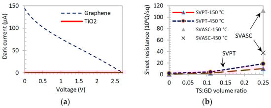 The dark current-voltage (I-V) and sheet resistance curves are affected by the presence of TiO2 in graphene-TiO2 thin films [2,38], because TiO2 behaves as an insulator in the dark. The I-V curves shown in Figure 7a confirm that TiO2 thin film creates no current in the dark, whereas graphene thin film is highly conductive. The Hall measurements of Figure 7b show that the sheet resistance of graphene-TiO2 increases by increasing the TiO2 content, as expected. The sheet resistance also increases in the films annealed at 450 °C, due to the formation of defects and voids in the film structure as a result of rapid drying, as discussed before. However, due to the synergic light-reactive function of TiO2 and graphene, a different optoelectronic behavior is observed when the films are exposed to broadband illumination.