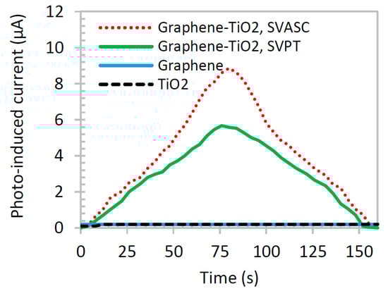 Figure 8 shows the photoinduced current of graphene-TiO2 thin films compared with those of pristine TiO2 and graphene thin films. The illumination source was blocked after about 80 s. TiO2 and graphene films show negligible photoinduced current response, individually (overlapped in the x axis of the graph), whereas graphene-TiO2 films demonstrate a good synergic photocurrent generation. The SP2 barrier effect of –O and –OH groups in graphene networks may be responsible for its negligible photocurrent activity [39]. Also, the large band gap and extremely short lifetime of excitons in TiO2 result in poor photoinduced current. On the other hand, when combined in the form of graphene-TiO2 thin film with a well-structured architecture, the composite film benefits from the high photoinduced charge dissociation of TiO2 at the presence of graphene, increased absorption range, particularly at Ti-O-C bonds, and prolonged recombination provided by graphene. The larger photoinduced responses of the thin films fabricated by SVASC are consistent with the aforementioned characterization results, i.e., the improved structural arrangement and the good uniformity and higher content of TiO2 in spray-on thin films, compared to those of the spun-on thin films.