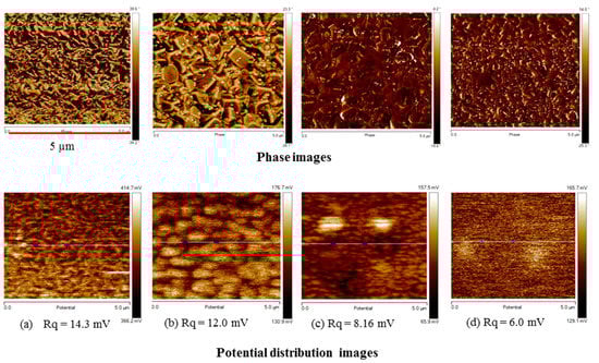 We also investigated the distribution of surface potential and phase images by atomic force microscopy (AFM) (Figure 9). The potential roughness (Rq) indicates the deviation in distribution of the surface potential. Figure 9 shows that an increase in the TiO2 content results in a decrease in Rq, because as shown in SEM images of Figure 3 and AFM phase images of Figure 9, the addition and increase of the TiO2 content has a positive effect on the surface uniformity and structural homogeneity. The potential roughness of the spin-SVPT graphene film decreases from 14.3 to 12 mV by adding a small amount of TiO2 (TS:GD volume ratio of 1:9). A further increase in the TiO2 content (TS:GD volume ratio of 1:4) results in further reduction of potential roughness to 8.16 mV. With the same precursor solution, the SVASC film shows the lowest potential roughness of 6 mV. The potential profiles and the peak-to-valley roughness values along the lines shown on the potential maps are displayed in Figure S4 of the Supplementary Materials. The variation of peak-to-valley roughness is consistent with the Rq roughness of Figure 9. The size of the graphene nanosheets and TiO2 particles (bright spots) can be inferred from some of the AFM phase images.