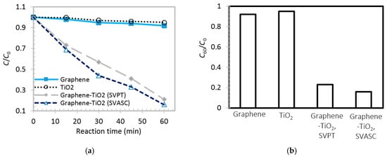 To test the photocatalytic activity of graphene-TiO2 thin films, the best graphene-TiO2 films (spin-SVPT and SVASC, deposited from the solution with TS:GD volume ratio of 1:4 and annealed at 150 °C) in terms of functionality, composition and uniformity, as well as pristine TiO2 and graphene thin films, were subjected to photodegradation analysis. Figure 10a,b show the time-varying and maximum degradation performance (after 60 min) of the abovementioned films, respectively. The TiO2 thin film shows a poor photodegradation of MB in water, less than 8% after 60 min. This low photocatalytic performance may be attributed to the fast charge recombination [44,45]. Graphene thin film also shows a poor involvement in chemical conversion, as observed by others also, e.g., [46], here about 5% after 60 min. In the case of graphene-TiO2 thin films, it is observed that under illumination, the spin-SVPT and SVASC samples linearly degrade the contaminant, and after 60 min about 77% and 84% of MB in water is removed, respectively. In graphene-TiO2 thin films, the photoinduced carriers from TiO2 are conducted within the graphene network, leading to longer carrier lifetime. Moreover, the increased photoconversion might be due to better trapping of the contaminants, owing to the large surface area of the 2D structure of graphene, and the unsaturated functional groups on graphene sheets [7,19]. The photoconversion performance and degradation rates observed in Figure 10 are consistent with photoinduced current results of Figure 8. It is worth noting that the obtained photoinduced reaction rates of the composite films are comparable with few similar works available in the literature [3,7,18], but in the present study, the films contain both TiO2 phases and are fabricated using scalable and facile spray coating at much reduced annealing temperatures, achieved by ultrasonic vibration.