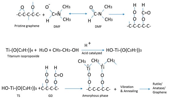 The top reaction shows the dispersion of graphene nanosheets in DMF. The middle reaction shows the coordination between TiO2 precursors. The bottom reaction shows mixing of graphene and TiO2 precursors and the sol-gel process assisted by ultrasonic vibration.