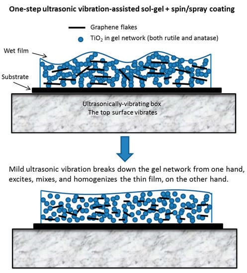 The process of graphene-TiO2 thin film formation by low-temperature ultrasonic vibration-assisted spin and spray coating in a sol-gel route.
