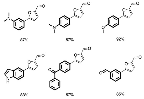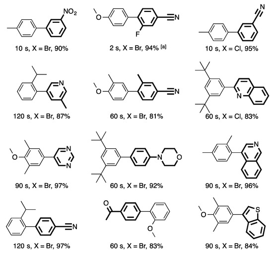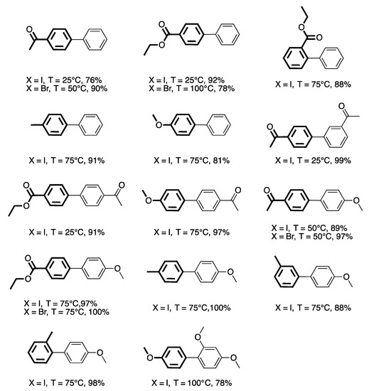 Application of the above protocol with little variations to the production of biphenyl compounds was reported (Figure 2). In function of the different steric and electric demands in the aromatic core, the coupling gave satisfactory yields [94].