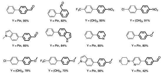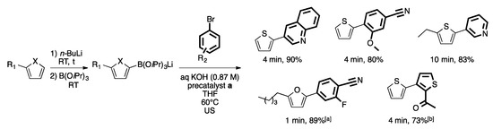 Application of the method was realized to show the scope of the reaction [84]. Starting from thiophene, 2-alkylthiophene and 2-alkylfuran, borylation in two steps was efficient: the coupling with different substituted aryls and heteroaromatic halides afforded the target compounds in good yields (Scheme 6). This novel process allows the use of low-cost heteroarenes instead of more expensive and unstable 2-heteroaromatic boronic acids and 2-heteroaromatic bromides.