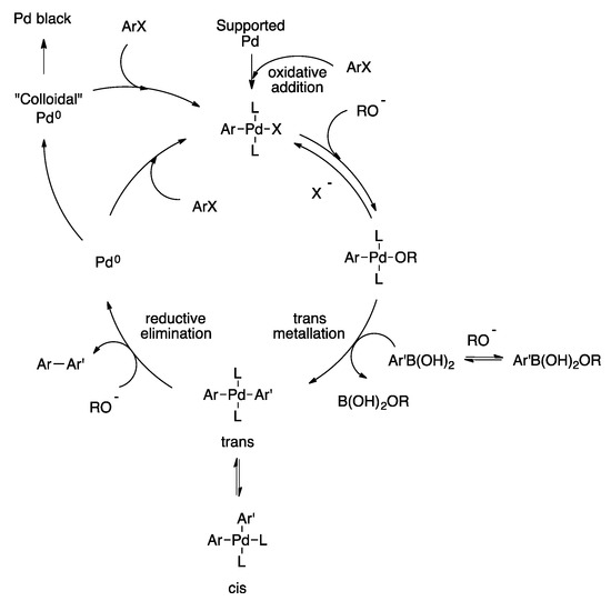 The Suzuki–Miyaura cross-coupling reaction [12,13,14,15,16] is one of the most versatile and frequently employed method for C–C bond formation. It consists of the coupling of organoboron compounds (organoborane, organoboronic acid, organoboronate ester and potassium trifluoroborate) with aryl, alkenyl and alkynyl halides. Nowadays, a large variety of boronic acids are commercially available. The general Suzuki–Miyaura catalytic cycle occurs through oxidative addition, transmetallation and reductive elimination [13,14,15,68,69,70]. After formation of the catalytic species Pd(0), generated in situ starting from palladium Pd(II) or directly from Pd(0) derivatives, oxidative addition of the aryl halide ArX furnishes the palladium complex (ArPdXLn). The transmetallation step occurs by conversion of the palladium halide (ArPdXLn) in the presence of the base RO− to a nucleophilic palladium alkoxy complex (ArPdORLn). This complex subsequently reacts with a neutral organoboron compound Ar’B(OH)2 to afford the diaryl complex (ArPdAr’Ln) in a cis–trans equilibrium. Then, reductive elimination of the cis form gives the biaryl derivative Ar–Ar’ and Pd(0) (Scheme 1) [15].
