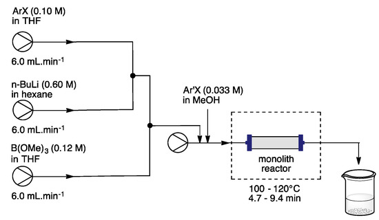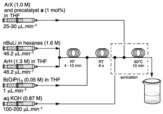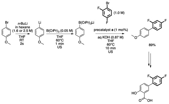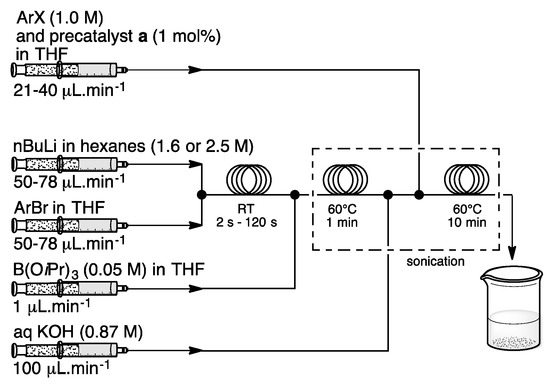 Buchwald reported an efficient synthesis of biaryls from aryl halide substrates using a successive lithiation/borylation/Suzuki–Miyaura cross-coupling sequence in three successive mesoreactors [84]. Starting from aryl bromide, the bromine-lithium exchange afforded the corresponding aryllithium which reacted with borate to form the boronate agent. Conventional Suzuki–Miyaura cross-coupling reaction using homogeneous second-generation palladium let precatalyst a furnished the target biaryl derivatives (Scheme 3). One of the main drawbacks of this nice concept was the formation of solids such as lithium triisopropylarylborate during the process; optimization of the nature of the solvent (THF and H2O), the concentration of reagents and the use of acoustic irradiation have been reported to avoid the formation of such solids.