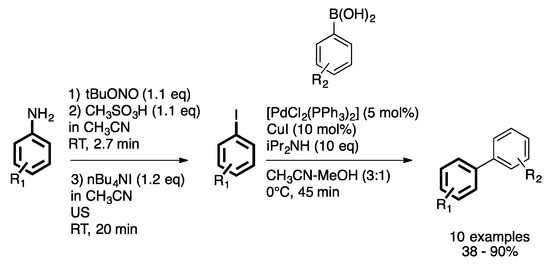 A three-step flow diazotization, iododediazotization and Suzuki–Miyaura cross coupling reaction has been reported by Organ starting from aniline derivatives [94]. Starting from the arylamine, the diazotation followed by the introduction of iodide atom furnished the iodobenzene derivatives. Then conventional Suzuki–Miyaura cross coupling afforded the biphenyl derivatives (Scheme 8).