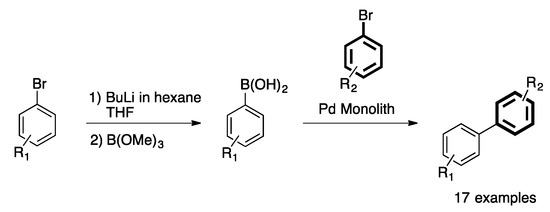 - Nagaki, A.; Hirose, K.; Moriwaki, Y.; Mitamura, K.; Matsukawa, K.; Ishizuka, N.; Yoshida, J. Integration of borylation of aryllithiums and Suzuki-Miyaura coupling using monolithic Pd catalyst. Catal. Sci. Technol. 2016, 6, 4690–4694. [Google Scholar] [CrossRef]