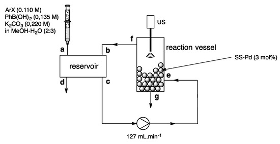 A large-scale Suzuki–Miyaura cross-coupling reaction using solid supported palladium Pd0 nano/microparticles and ultrasound irradiation was reported in continuous flow by Das [101]. The continuous flow technique used by the authors required a syringe, a reservoir, a pump and a reaction vessel. After the introduction of the aryl bromide, phenylboronic acid and potassium carbonate in MeOH-H2O in the reservoir via the syringe a, the reagents were pumped (127 mL min−1) to the reaction vessel e where the solid supported palladium (0) nano/microparticles (SS-Pd) as heterogeneous catalyst had been charged. Ultrasonication of the mixture (20 kHz) was realized and the reaction product was poured through b into the reservoir. Two exits (d and g) were present to recover the mixture after completion of the reaction (Scheme 14). In comparison with microreactor and mesoreactor, this process permitted to furnish biaryl derivatives on a gram scale in continuous flow.