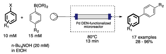 A very nice strategy based on dendrimer-encapsulated Pd nanoparticles as catalyst in flow reactor was developed by Verboom [103,104]. In contrast with the conventional heterogeneous Suzuki–Miyaura cross-coupling reaction using cartridge filled with solid catalysts, Verboom’s method anchored Pd nanoparticles onto the inner walls of the flow reactor. Aryl halides (10 mM) were mixed with boronic acid derivatives (15 mM) in ethanol at 80 °C using n-Bu4NOH (20 mM) as base at 80 °C. The solution was passed through the catalytic microreactor with a residence time of 13 min (Scheme 18).