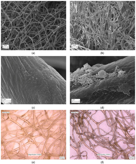 The marine keratosan demosponges exhibit a three-dimensional open network structure built from similar, branched spongin fibers with a slightly corrugated surface at a diameter of 20 μm [32,33]. SEM images taken after enzyme immobilization (process parameters: 2 h process duration, 4 °C, pH 7) confirmed the successful deposition of the lipase by the presence of enzyme aggregates on the surface of the spongin fibers, as mentioned previously [34]. These results are confirmed by observations from digital microscopy (Figure 1e,f). It should also be noted that sponge’s fibers are coated by the enzyme particles that formed aggregates of various shapes and sizes.