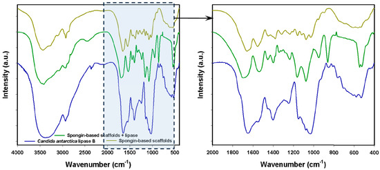 The spongin-based scaffolds, free CALB and obtained biocatalytic system were analyzed by FTIR. The spectra obtained for these materials are presented in Figure 2.