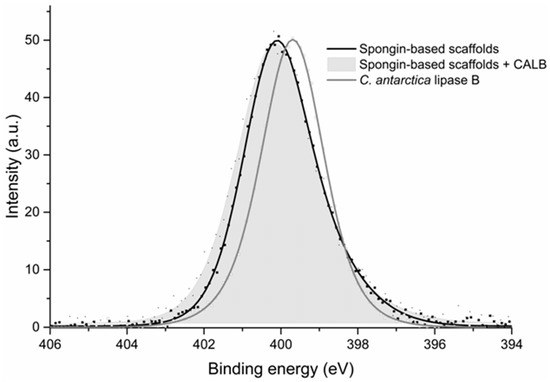 X-ray photoelectron spectroscopy (XPS) N 1s spectra for C. antarctica lipase B, spongin-based scaffolds and the product after immobilization of lipase.