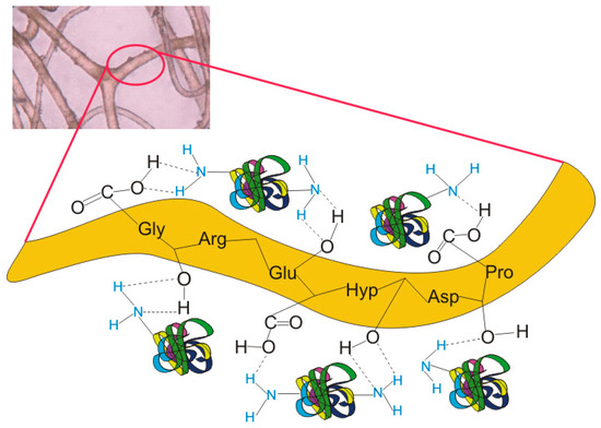 It is important to evaluate the effect of the interactions on the properties of the resulting enzyme—spongin systems. For this purpose, this work attempted to determine the mechanism of the enzyme particles attachment. Based on the results obtained (FTIR, 13C NMR and XPS) it is claimed that the mechanism is based on the formation of hydrogen bonds, as presented in Figure 6.
