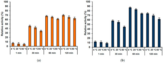 Immobilized lipase activity recovery as a function of temperature and process duration. The process was carried out at pH 7 from lipase solution at concentrations of: 1 mg/mL (a); and 3 mg/mL (b).