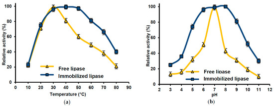 Improvement of thermal and chemical stability is an effect of the interactions created between the enzyme and the support. These protect the tertiary and quaternary structure of the enzyme from conformational changes. Additionally, binding of the enzyme to the carrier stabilizes the whole enzyme particle and preserves it against denaturation under harsh reaction conditions [50]. The results presented by Zhu et al. [51] also show an increase in the pH resistance of the immobilized lipase.