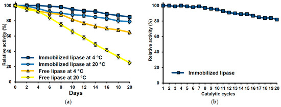 The relative activity was evaluated every 2 days for free and immobilized form of lipase stored for 20 days in a buffer at pH 7, at both 4 and 20 °C.