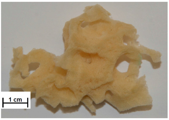 For the proper preparation of the spongin-based scaffolds from H. communis demosponges their cell- and debris-free skeletons were initially washed with distilled water to dissolve water soluble salts. After that selected skeletons were immersed in 3 M HCl for 72 h at 24 °C to dissolve possible calcium carbonate microparticles of natural origin. The scaffolds (Figure 11) were rinsed with distilled water until the pH reached 7. Finally, the spongin-based scaffolds were dried at 50 °C for 24 h and stored in plastic bags at room temperature.