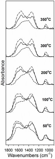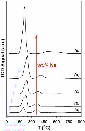 Carbon dioxide is acidic and thus is an excellent probe molecule for metal oxides. DRIFTS results shown in Figure 5 indicate that CO2 readily adsorbed on the activated catalyst, forming asymmetric (higher wavenumber) and symmetric (lower wavenumber) ν(OCO) stretching bands in the region between 1700 and 1200 cm−1 []. Figure 5 shows that there was more carbonate adsorbed on the catalysts with higher Na doping levels, indicating that Na increased the support basicity. Moreover, Figure 4 and Table 2 show that carbonate was more strongly held on the catalysts with greater Na content. For example, Table 2 shows that by 350 °C, almost 60% of the carbonate had decomposed on the catalyst without Na doping, while just 38% and 24% had decomposed on the 1% and 2.5% Na doped catalysts, respectively, at 350 °C.