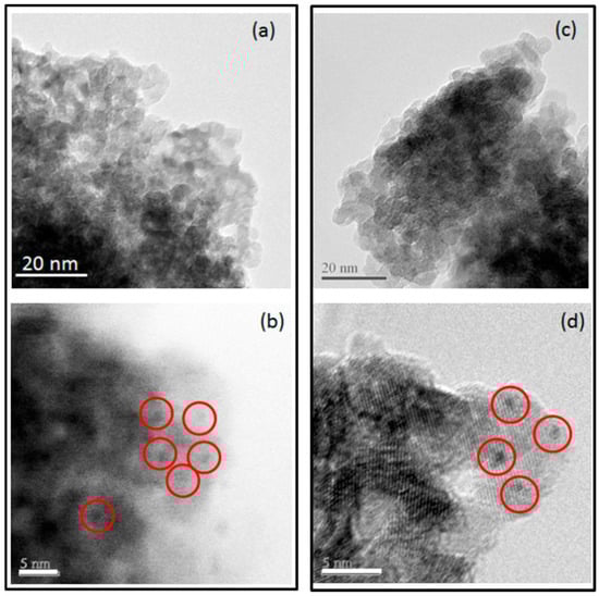 Figure 2a,b illustrate TEM and HRTEM results for Pt dispersion and particle size on catalyst support without Na. Figure 2c,d illustrate TEM and HRTEM results for Pt dispersion and particle size on catalyst support with Na. The Pt particle size range for both catalysts was similar and less than 2.5 nm.